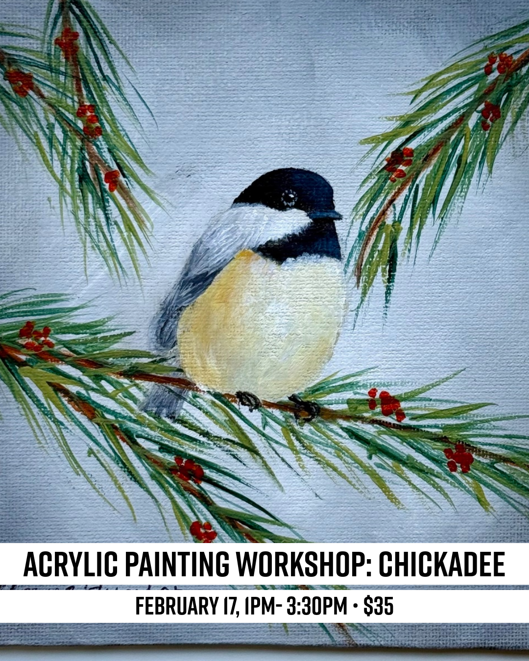 The class project for February is this beautiful chickadee! Paint a delicate, colorful bird while learning some cool acrylic techniques from Anne! All supplies are included in the price of the class.