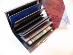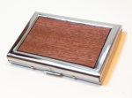 These hand-made Card Wallets are made of steel and finished with real Mahogany wood. The wood is hand-cut, then bordered in waterproof blank ink. (yes the wood really goes through a real typewriter!). These cases fit about 15 business cards.